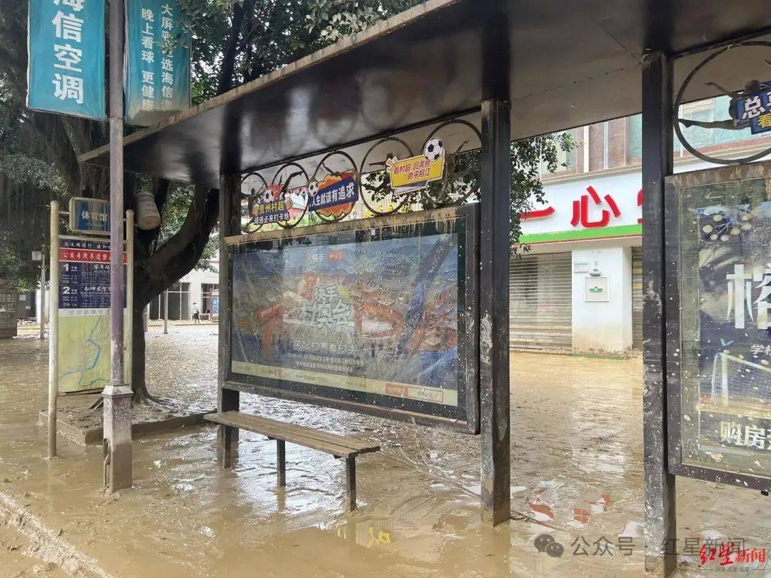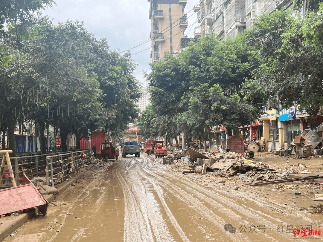 从高铁站到县城的路上,能看到6月24日第一波洪水到来时残留的垃圾和当时的水位线,但道路清理较为干净,并没有淤泥和积水,能够正常通行。