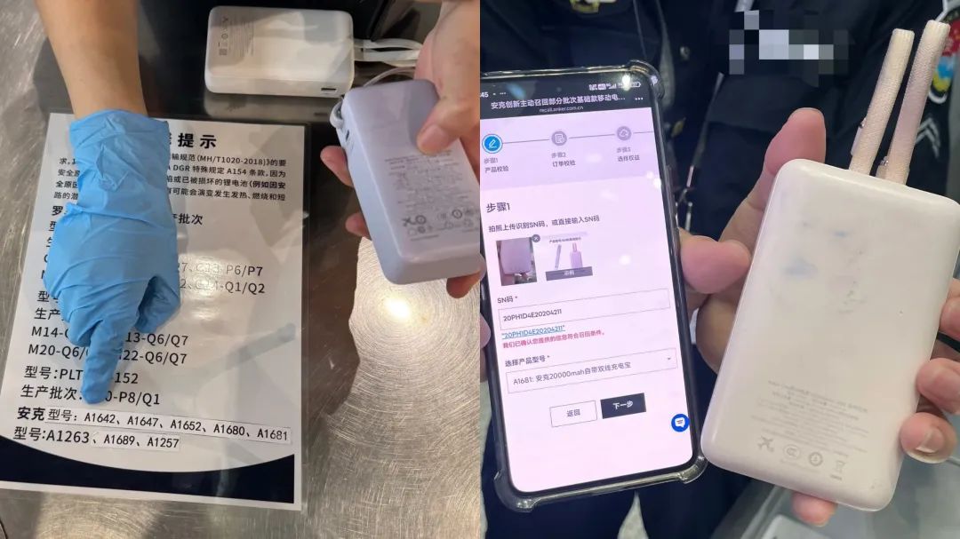 而在机场入口处,还会有安检工作人员一直提醒乘客,“不要携带无3C标识和被召回型号或批次的充电宝”。