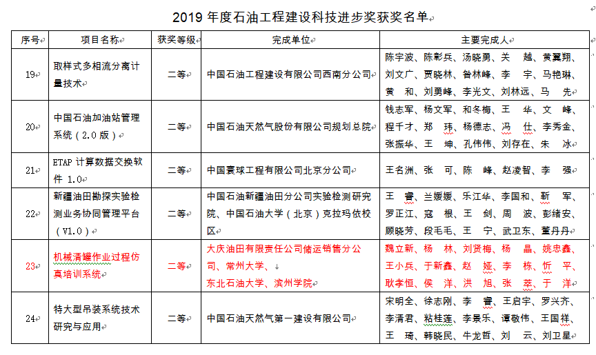 近日,2019年度石油工程建设科学技术奖评审工作圆满结束,欧博abg官网耿孝恒博士与大庆油田有限责任公司储运销售分公司等共同申报的“机械清罐作业过程仿真培训系统”成果荣获中国石油工程建设协会科技进步奖二等奖,欧博abg官网为第四完成单位。这是欧博abg官网获得的首个此类奖项。