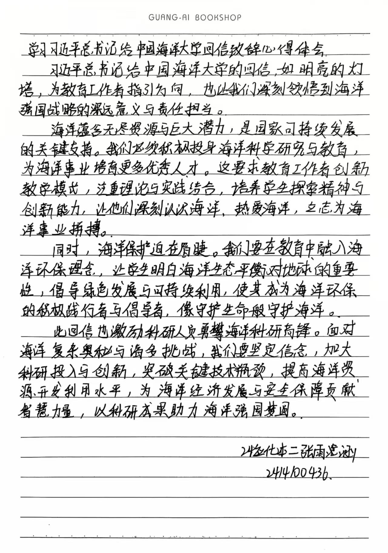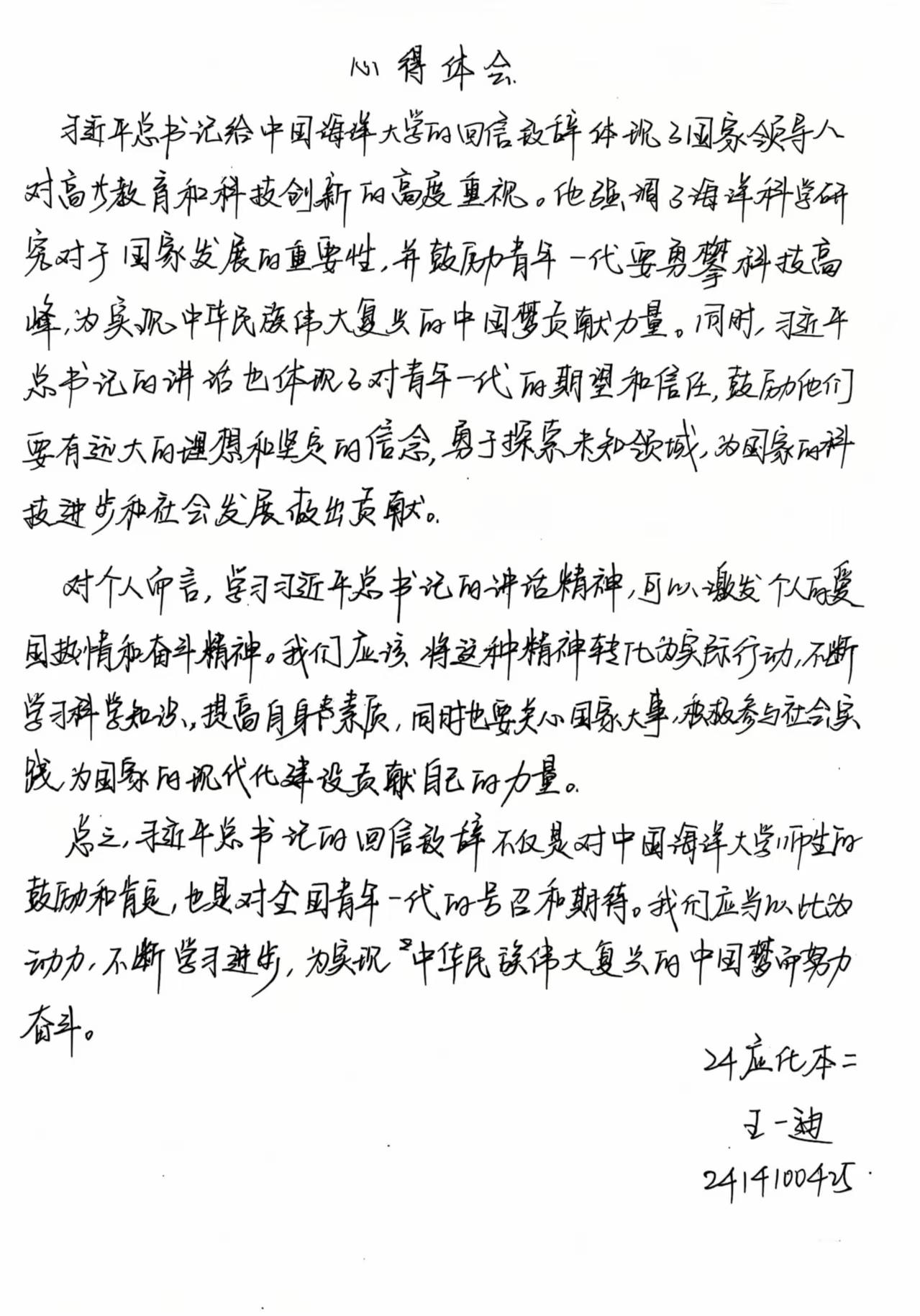 班会上,各班同学认真学习了习近平总书记给中国海洋大学全体师生的回信内容,深入领会其精神实质。通过详细的解读和关键词分析,同学们对回信中的核心思想有了深刻理解。习近平总书记的回信为高等教育的发展指明了方向,中国海洋大学等高校应以建校百年为新起点,积极响应国家战略需求,完善学科设置和人才培养模式,培养更多优秀的海洋人才,为教育强国和海洋强国建设贡献力量。