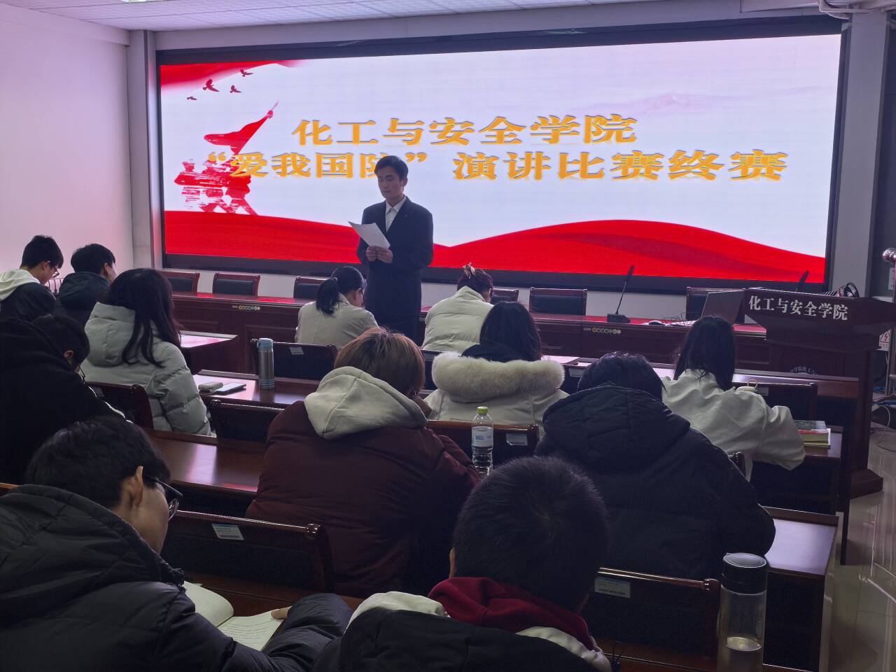 本次决赛评委由学生科辅导员杜金双、姚斌及学生会主席代表担任,确保了比赛的公平公正。比赛现场气氛热烈,选手们围绕“爱我国防”这一主题,结合自身经历和感悟展开精彩演讲。
